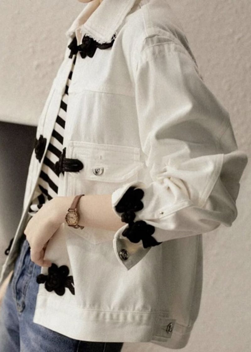 Nya Vita Peter Pan Krage Fickor Kinesiska Knapp Jeansjackor Våren