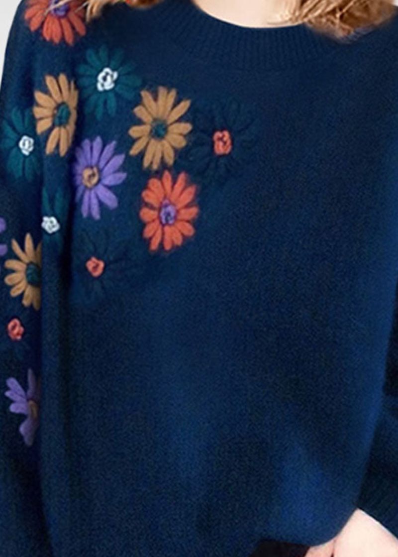 Plus Size Blå O-hals Blommiga Broderade Ylletröjor Vinter