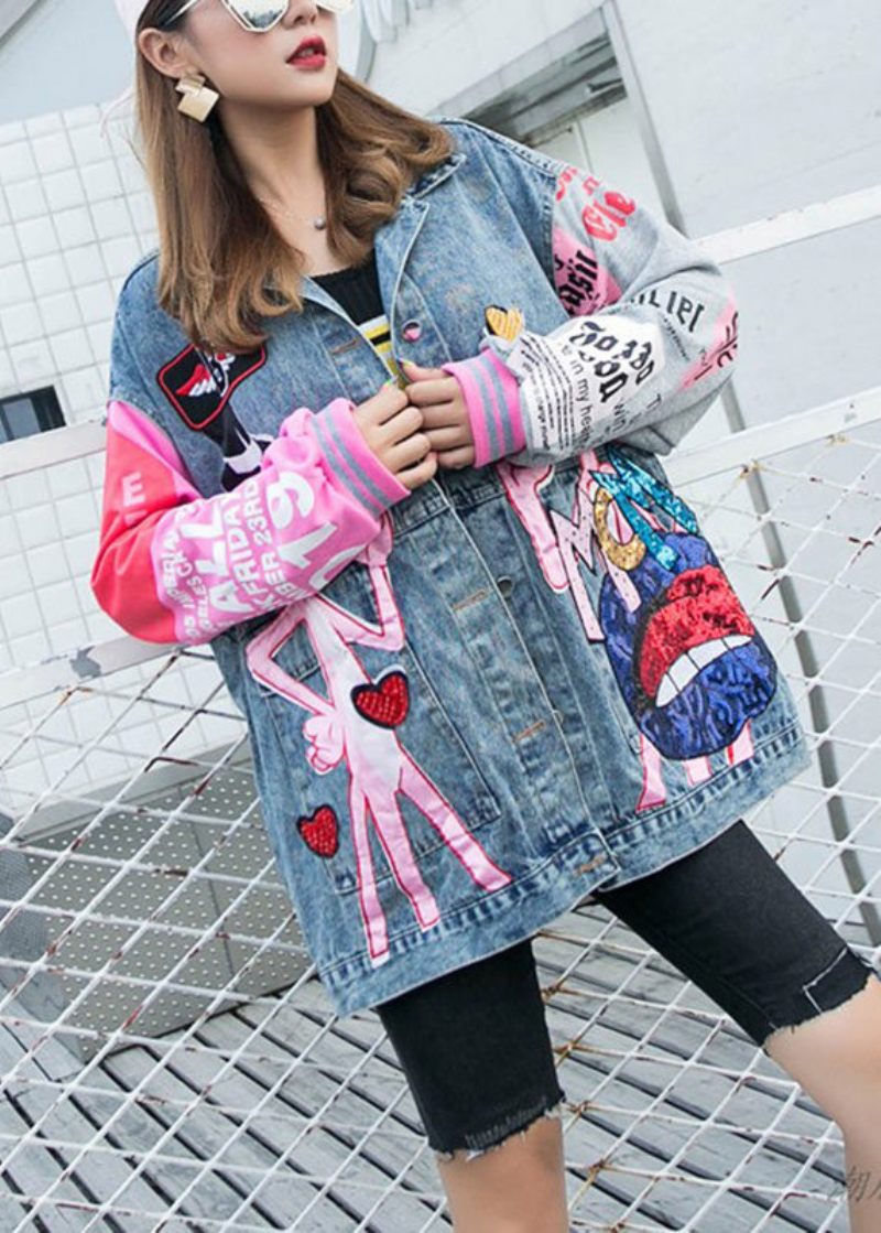 Plus Size Blå Peter Pan Krage Rosa Leopardtryck Patchwork Paljetter Knapp Jeansrock Långärmad