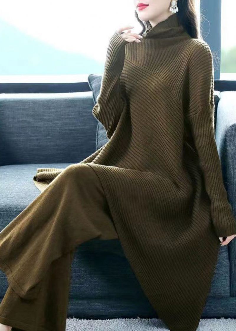 Plus Size Blackish Green Hign Neck Patchwork Ylle Tvådelad Kostym Set Hösten