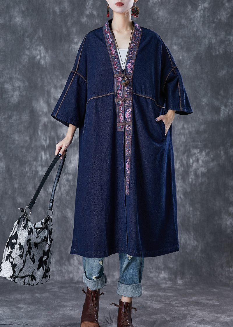 Plus Size Marinblå Broderad Kinesisk Knapp Denim Trench Fall