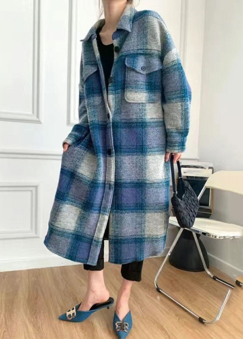 Plus Size Pläd Peter Pan Krage Knapp Ylle Långskjorta Kappor Våren