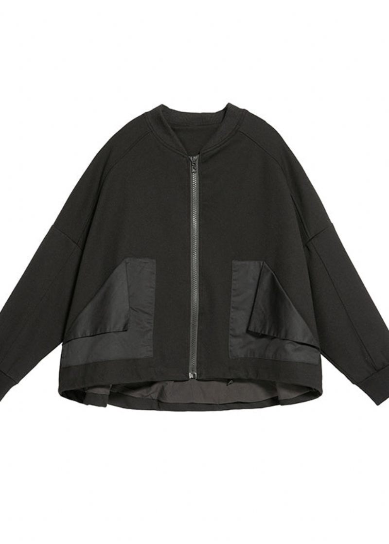 Plus Size Svart O-neck Fickor Med Dragkedja Patchwork Coat Långärmad