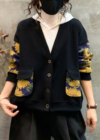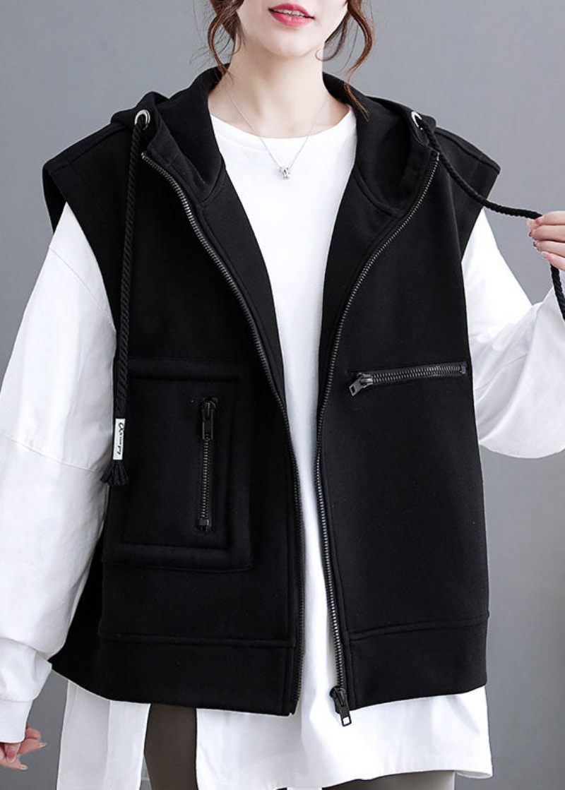 Plus Size Svarta Patchworkfickor Hoodie Väst Höst