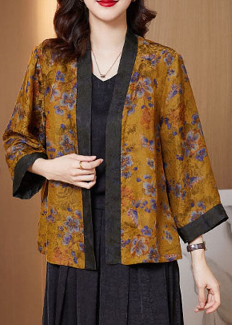 Plus Size Yellow Print Patchwork Silk Loose Cardigans Armband Sleeve