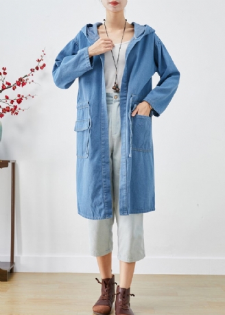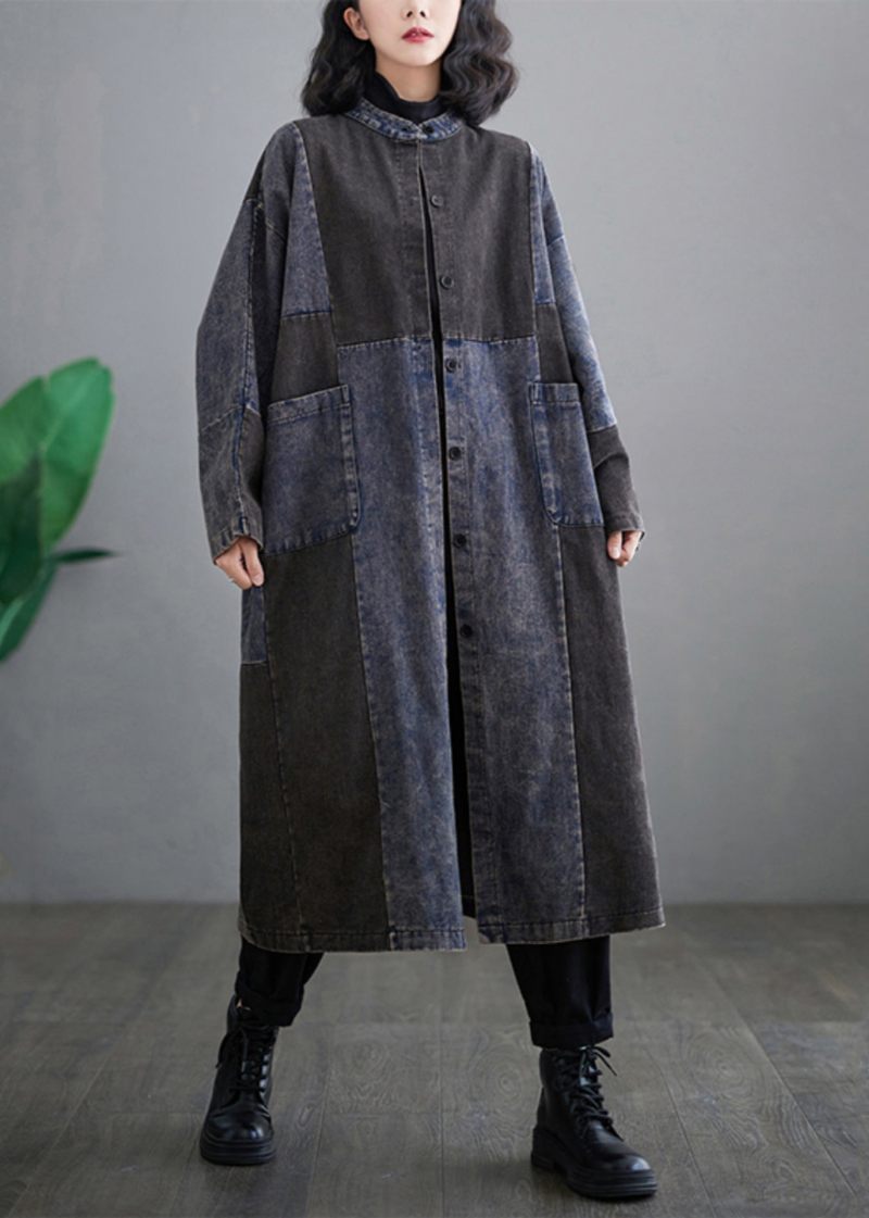 Retro Denim Blå Fickor Patchwork Knapp Långa Trenchcoats Långärmad