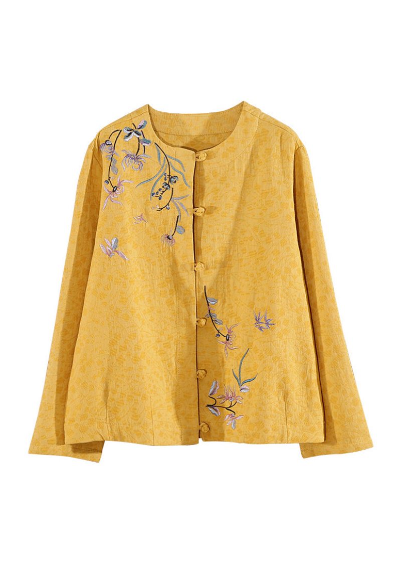 Retro Gul O-hals Broderad Bomull Kort Kappa Fjäder