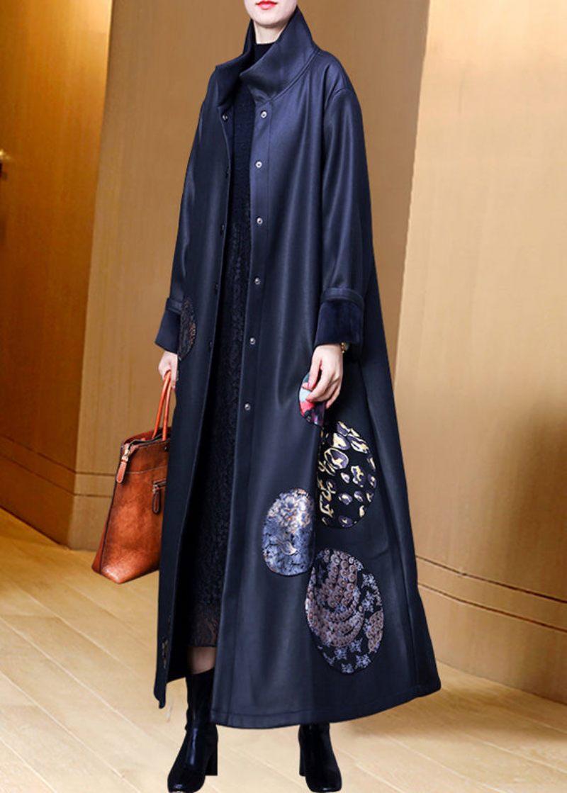 Retro Svart Stativ Krage Fickor Print Woolen Warm Fleece Trench Fall