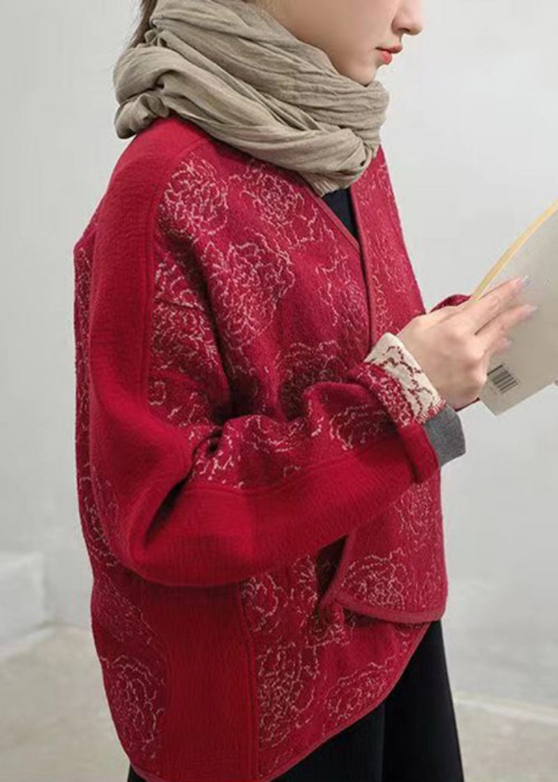 Röd Knapp Patchwork Yllerockar V-hals Långärmad