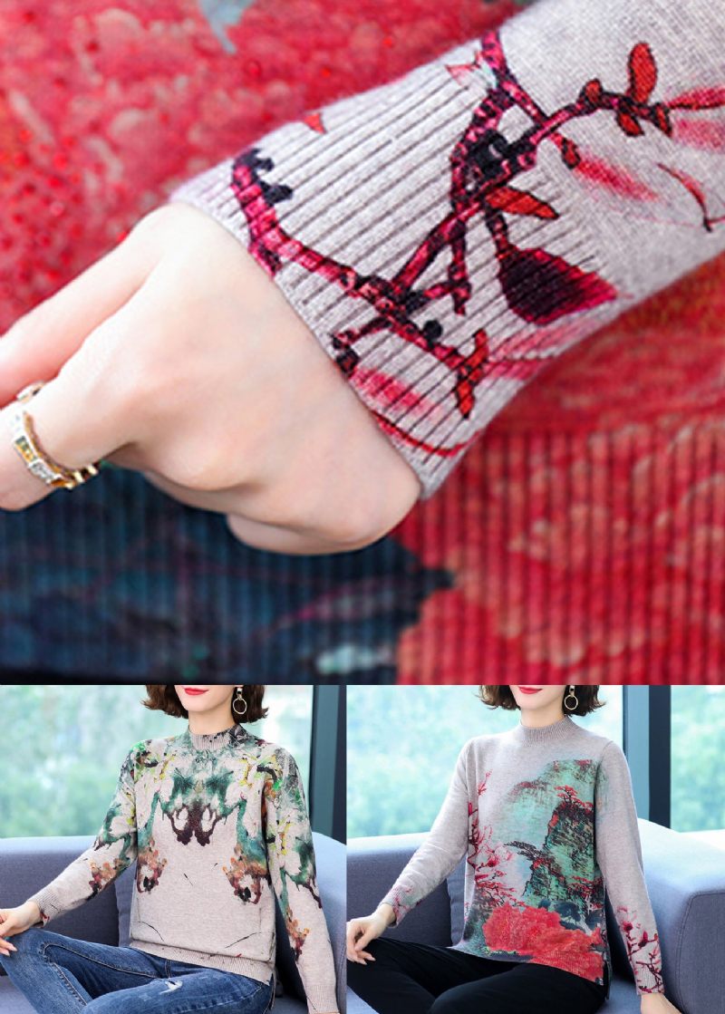 Röd Tryck Mjuk Ylle Kort Tröja Halvhög Hals Fjäder