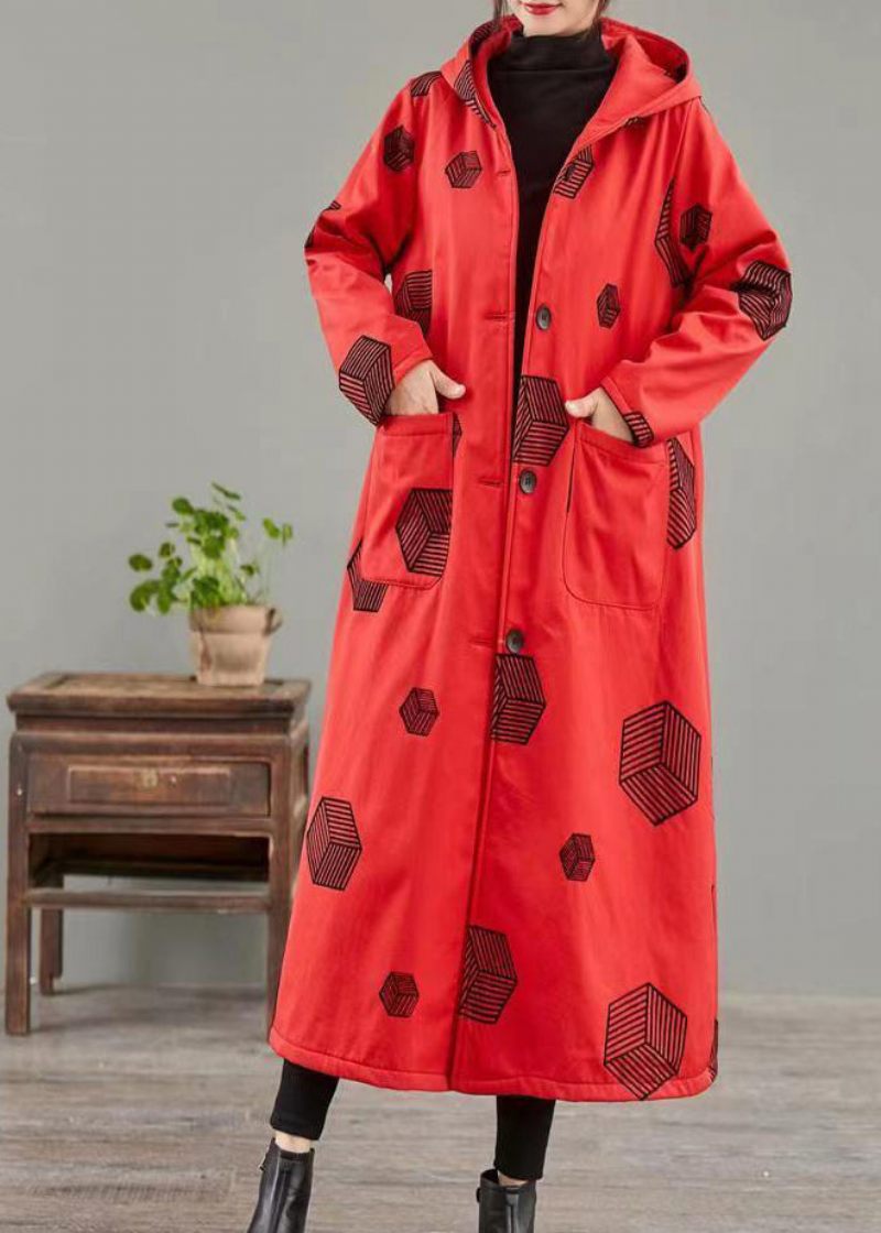 Röda Fickor Print Patchwork Varm Fleece Hoodie Kappa Vinter