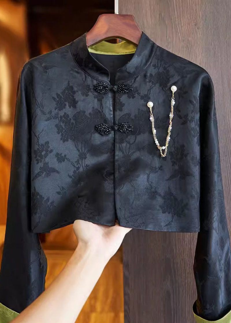 Slim Fit Svart Stativ Krage Broderad Knapp Siden Linne Kappa Långärmad