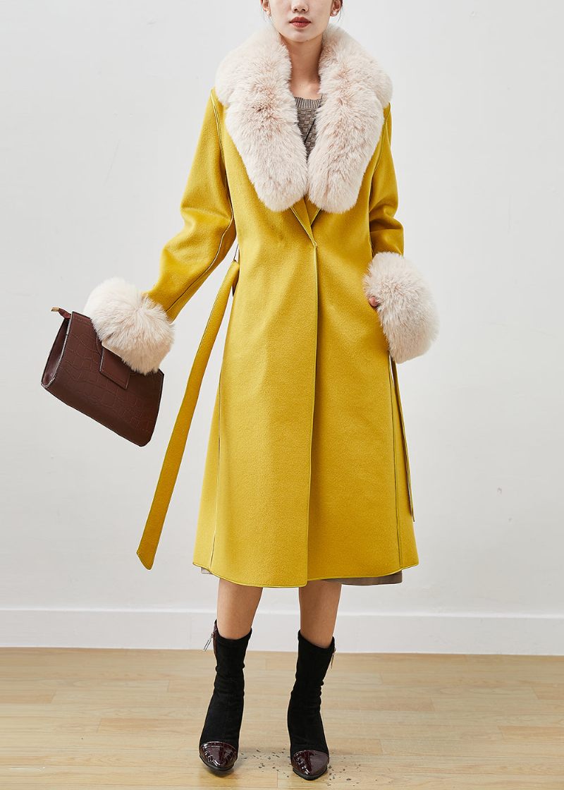 Snygg Gul Pälskrage Slips Midja Yllerockar Höst