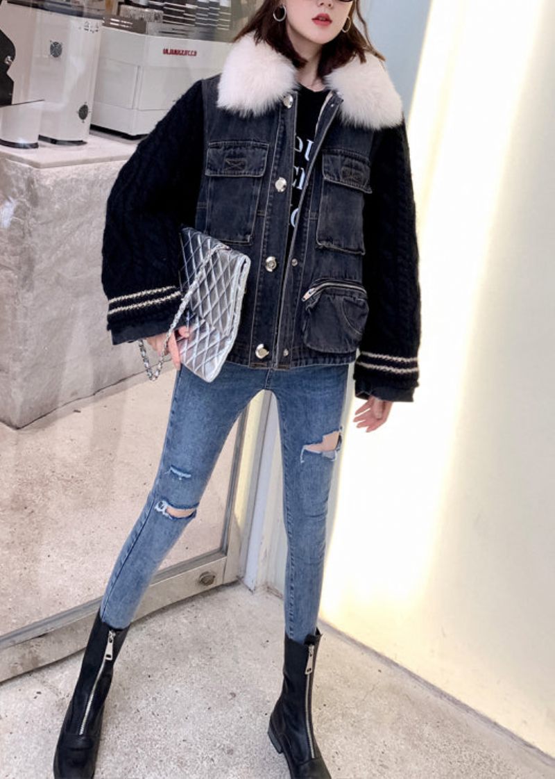 Snygg Stickad Patchwork Varm Fleece Jeansjacka Vinter