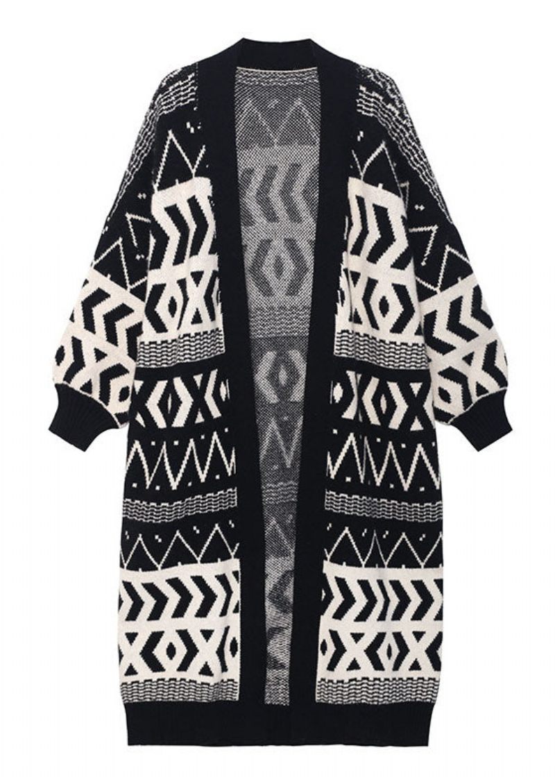 Snygga Svarta Fickor Knapp Jacquard Höst Långa Stickade Tröjor Kappa