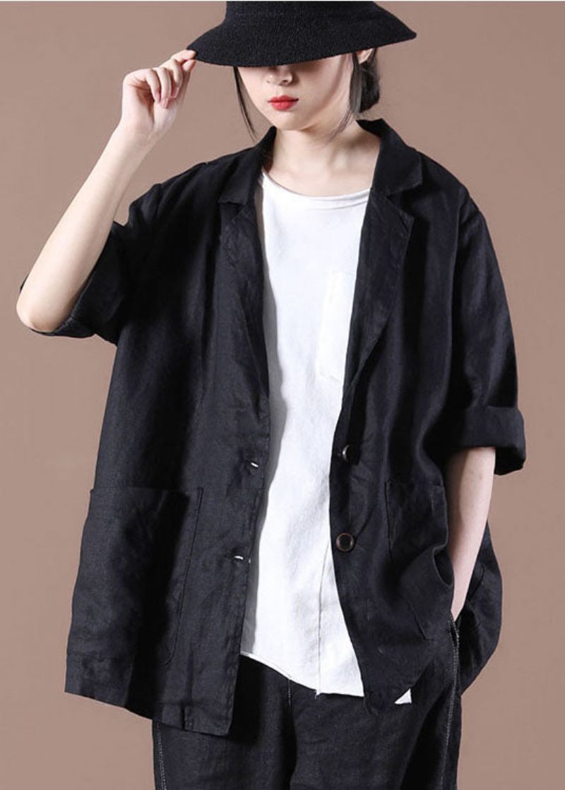 Solida Svarta Fickor Linnekappa Peter Pan Krage Knapp Långärmad