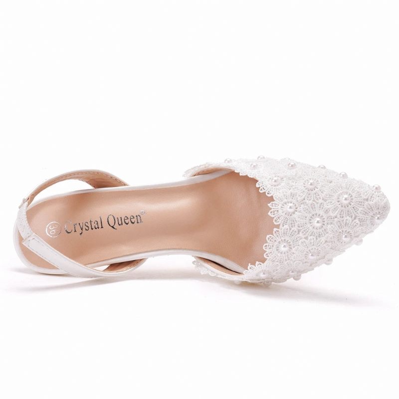 Sommar Eleganta Kvinnor 7 cm Högklackade Bröllopssandaler Designer Grunt Vita Spets Festskor