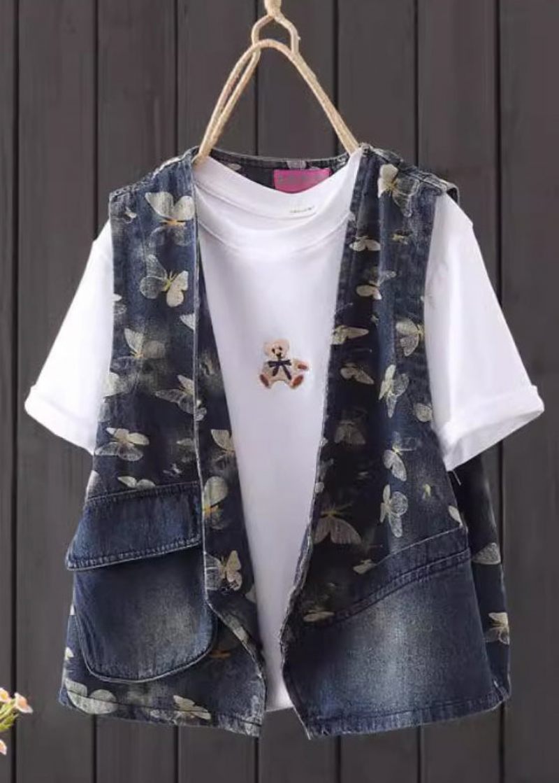 Stil Blå V-halstryck Fickor Denimrockar Höst