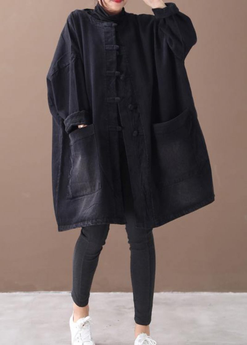 Stil Denim Svart Fina Kläder För Kvinnor O Hals Kinesiska Knapp Ytterkläder