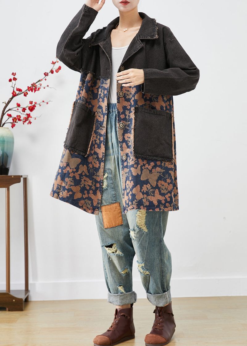 Stil Svarta Överdimensionerade Patchwork-fickor Print Denim Trench Fall
