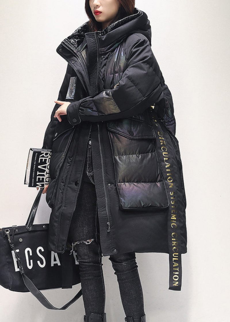 Stil Svarta Zip Up-fickor Grafisk Duck Down Hooded Parkaer Winter