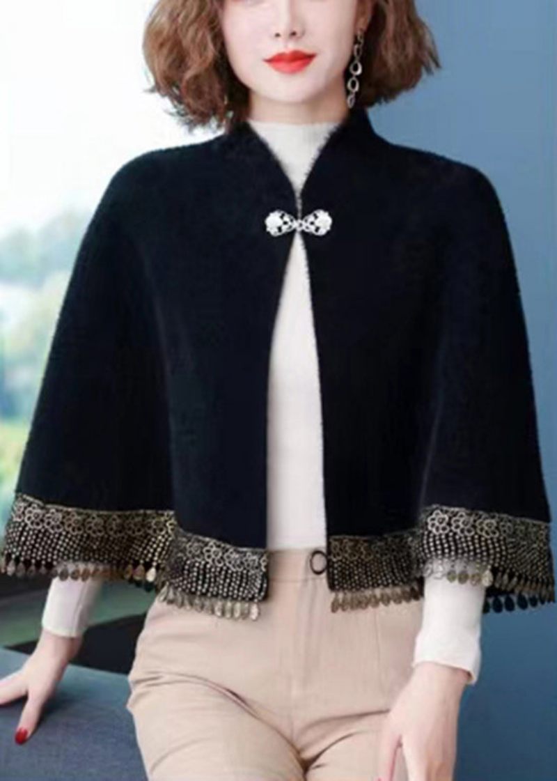 Svart Button Patchwork Lös Mink Velvet Coats Tasseled Batwing Sleeve