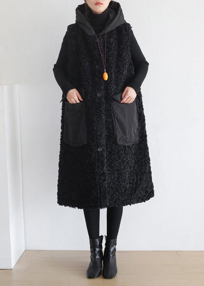 Svarta Fickor Tjock Ylle Huva Väst Ärmlös
