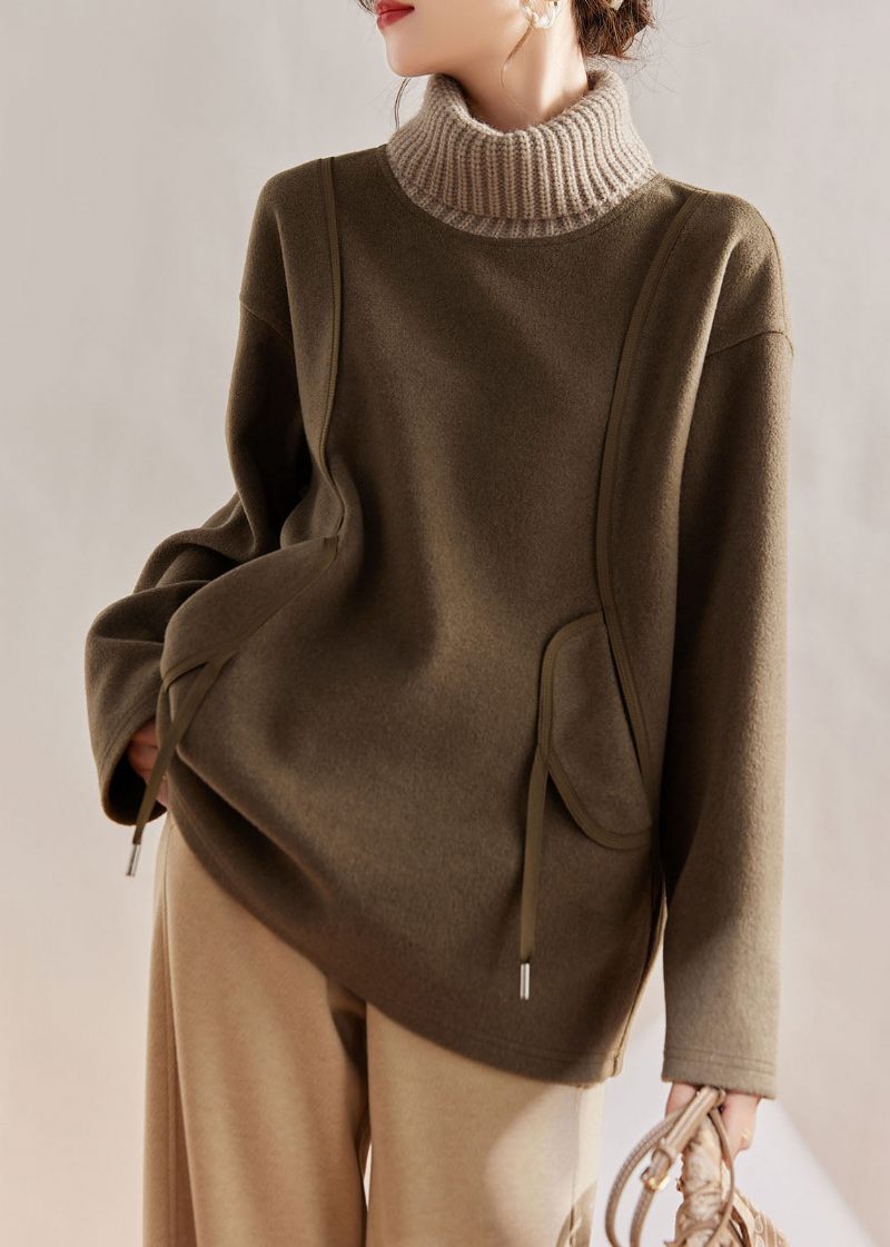 Unik Grön Turtleneck Stickad Patchwork Ylle Sweatshirts Långärmad