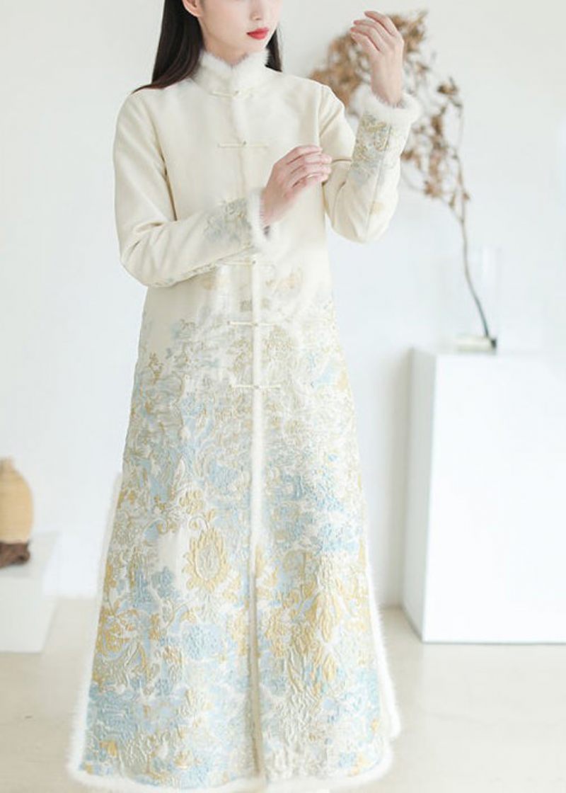 Unik Vit Jacquard Patchwork Mink Hår Fin Bomullsfylld Trenchcoat Vinter