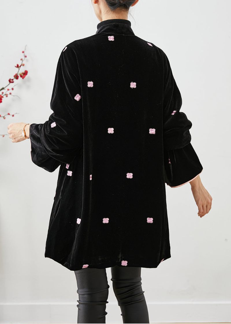 Unika Svart Broderade Kinesiska Knappar Silke Velour Kappor Vinter