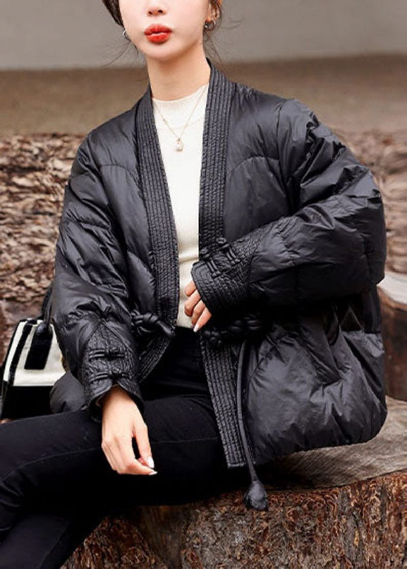 Vacker Svart V-hals Orientalisk Knapp Originaldesign Duck Dunrockar Vinter