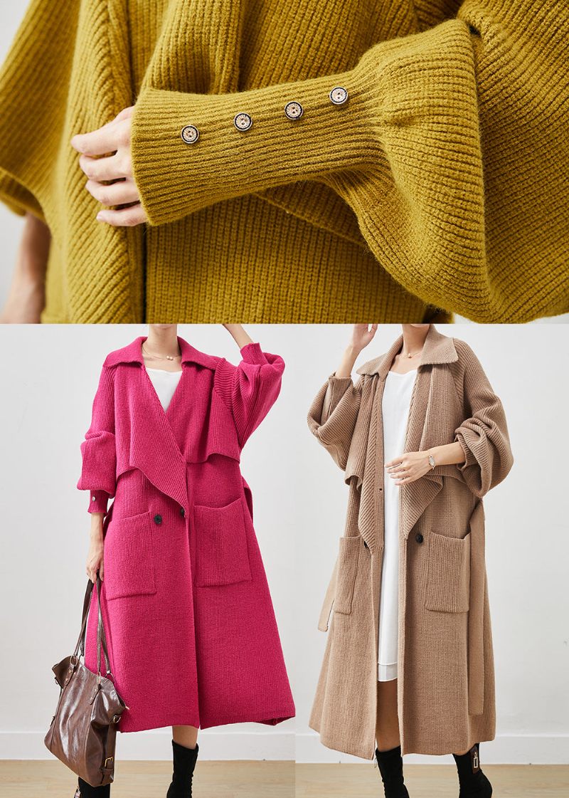 Vackra Gula Skårade Fickor Varm Stickade Trenchs Spring