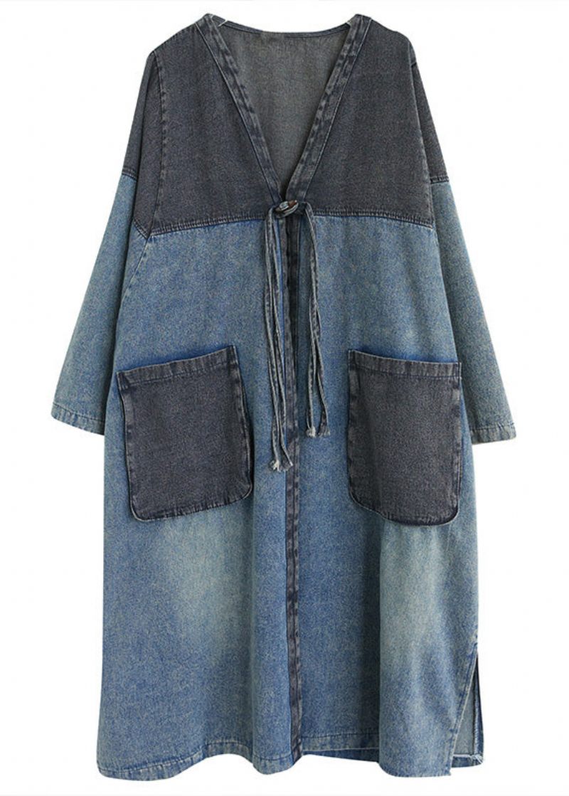 Vintage Denim Blå V-hals Patchwork Trench Coat Spring