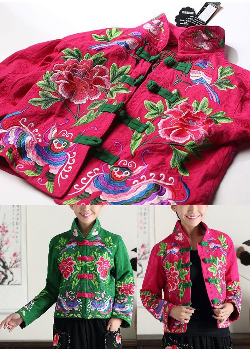 Vintage Grön Stativkrage Broderad Bomullsjacka Höst
