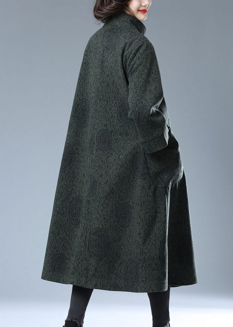 Vintage Gröna Kinesiska Knapptrycksfickor Patchwork Ylle Lång Trenchcoat Höst