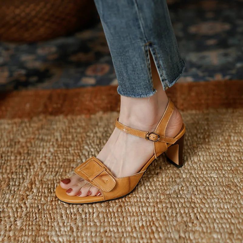 Vintage Lädersandaler Dam Spänne Sommar Sandaler Tjocka Högklackade Slingbacks Damsandaler