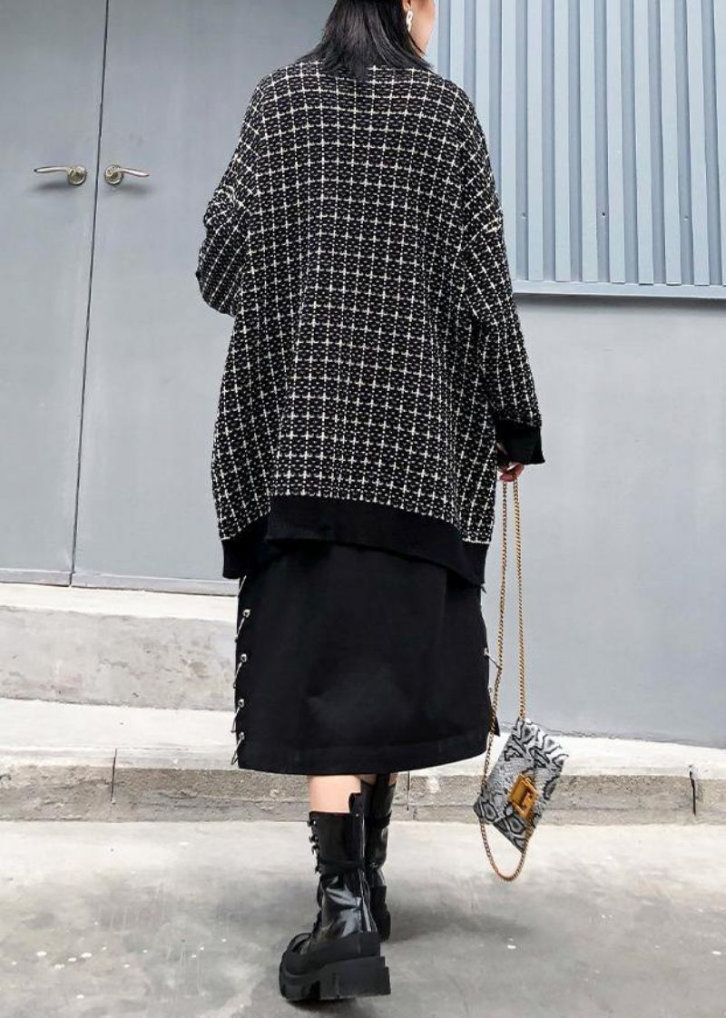 Vintage Rutig Svart Stickat Casual Koftor Med V-ringning