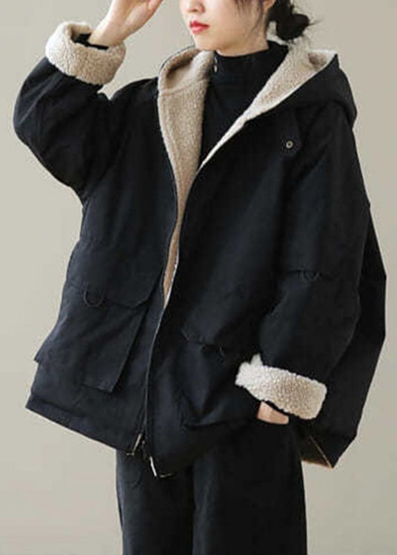 Vintage Svart Dragkedja I Fleece Ullfodrade Huvtröjor Parka Winter