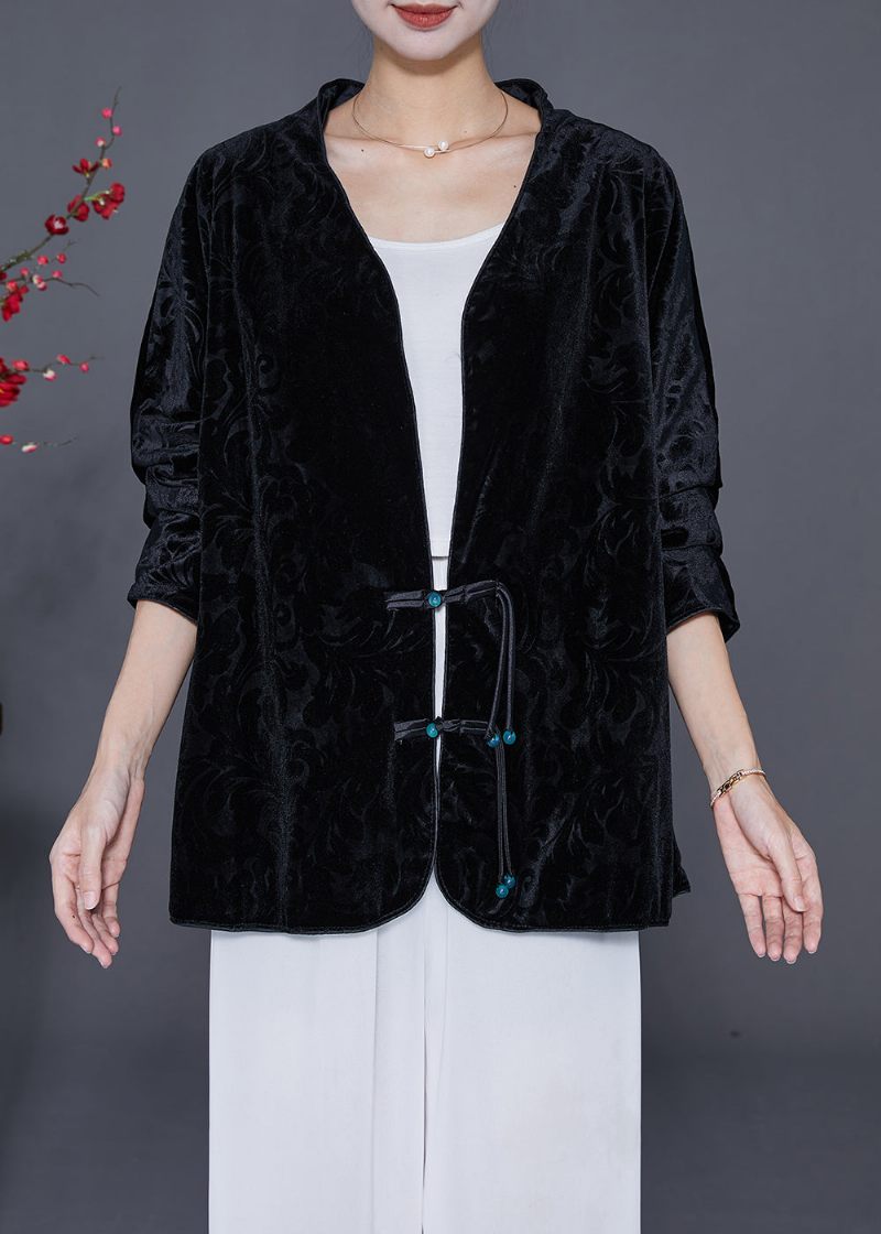 Vintage Svart Jacquard Kinesisk Knapp Silke Velourjackor Höst
