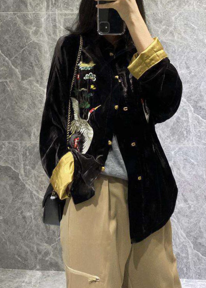 Vintage Svart Mandarinkrage Broderade Velourkappor Långärmad