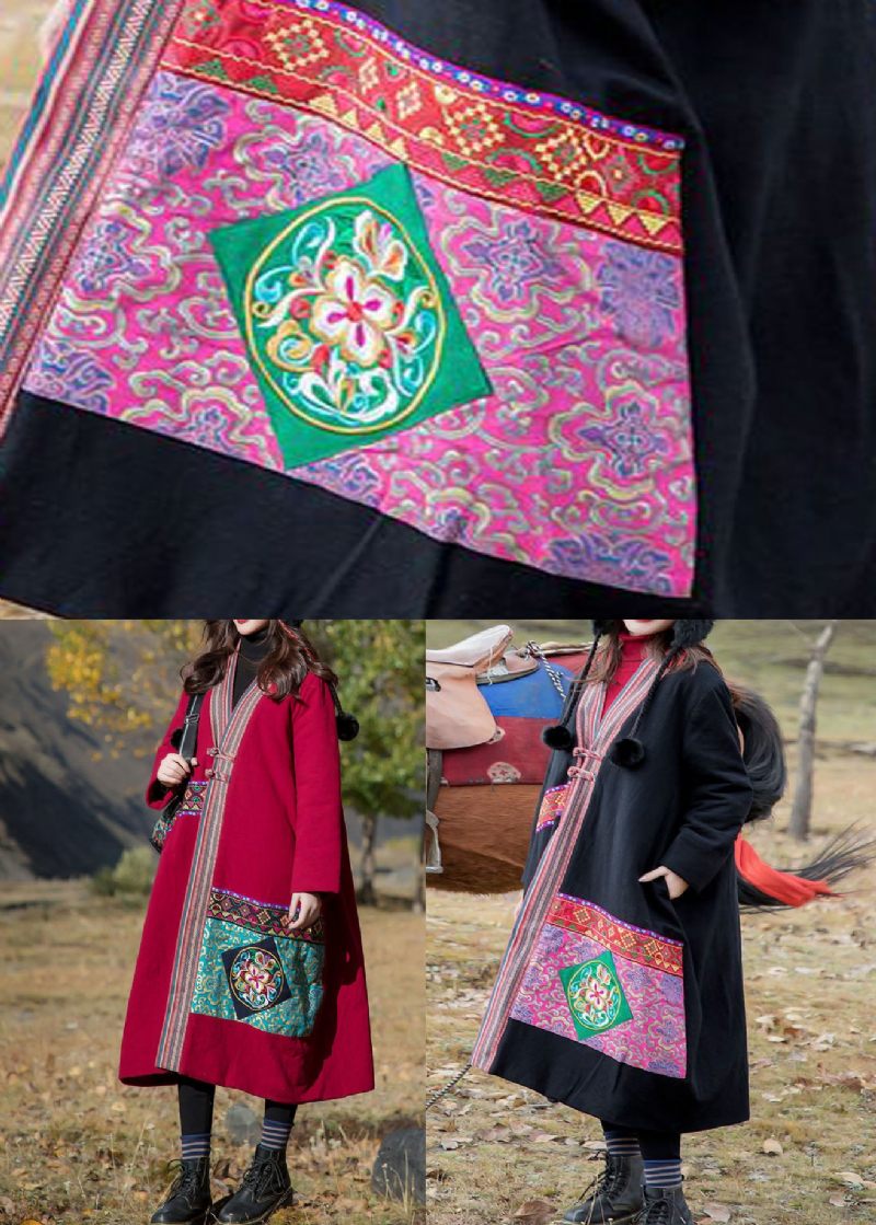 Vintage Svart V-hals Broderade Lapptäcksapplikationer Fin Bomullsfyllda Långa Kappor Vinter