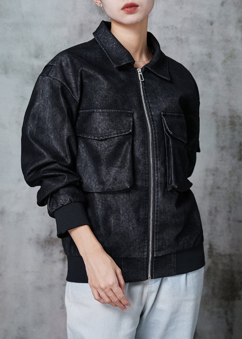 Vintage Svarta Överdimensionerade Fickor Faux Läderjacka Vår