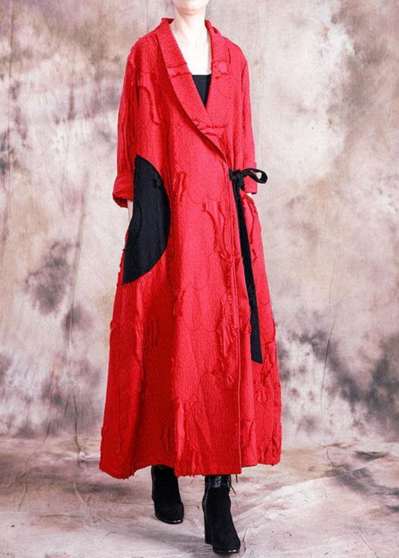 Vintage Trendig Plus Size Lång Höst Röd Turn-down Krage Knyt Midjerock
