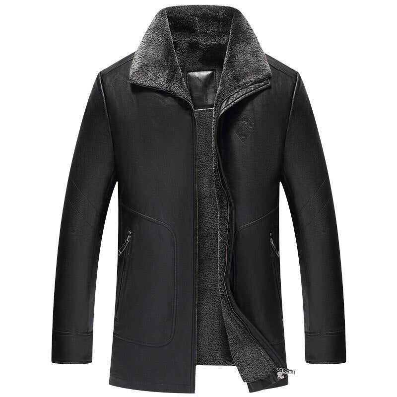 Vinter Lång Svart Fleece Parka Kappa Män Skinnjacka Överrock Plus Velvet Varm Pälskrage Pu Casual Brun Ytterkläder Vindjacka