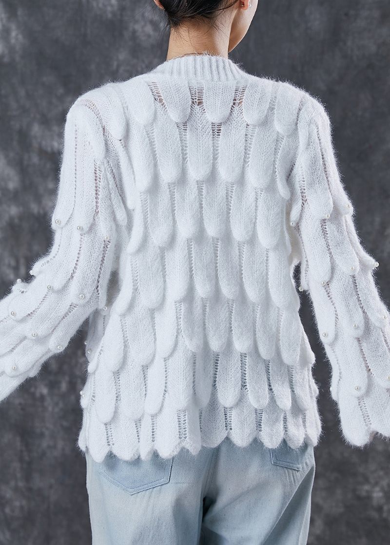 Vit Mysig Stickad Kofta Med V-ringad Spikpärlfjäder