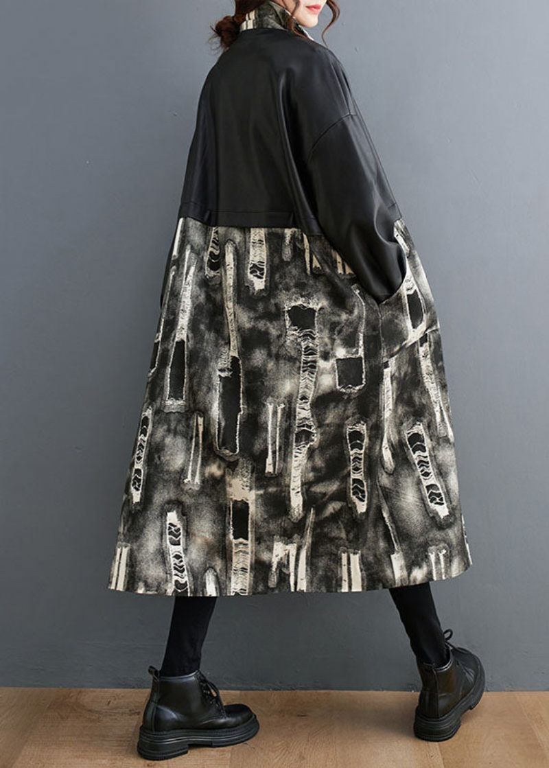 Vogue Svart Stativ Krage Tryck Konstläder Patchwork Långa Trenchcoats Långärmad